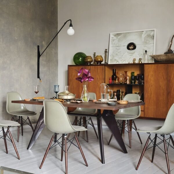Designed by Charles and Ray Eames, the DSR Chair RE pairs the sculptural elegance of its iconic ‘Eiffel Tower’ base with a seat made from post-consume…