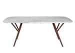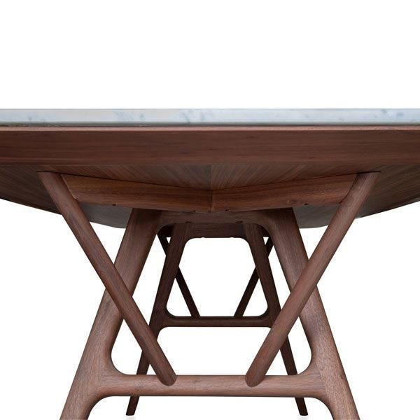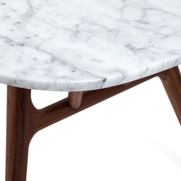 Features a uniquely shaped walnut base, completed by a marble table top.