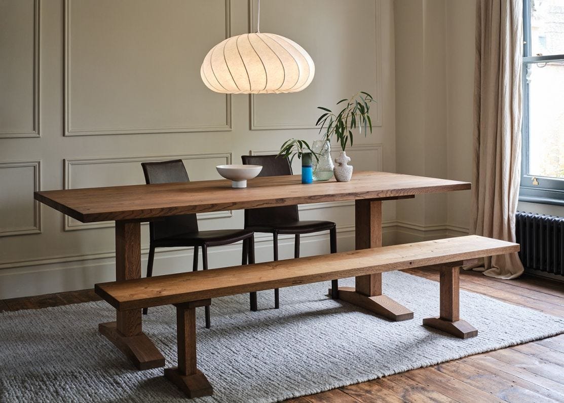 The Lisbon Dining Table from the Heal’s Bespoke Dining range combines traditional craftsmanship with contemporary versatility. Featuring a solid oak top and refectory-style legs, the design nods to the Arts & Crafts movement, celebrating honest materials and timeless construction. Crafted from solid oak or walnut, it’s available in a range of sizes, finishes and edge profiles. Natural variations in the grain, knots and tone give each table its own unique warmth and character.