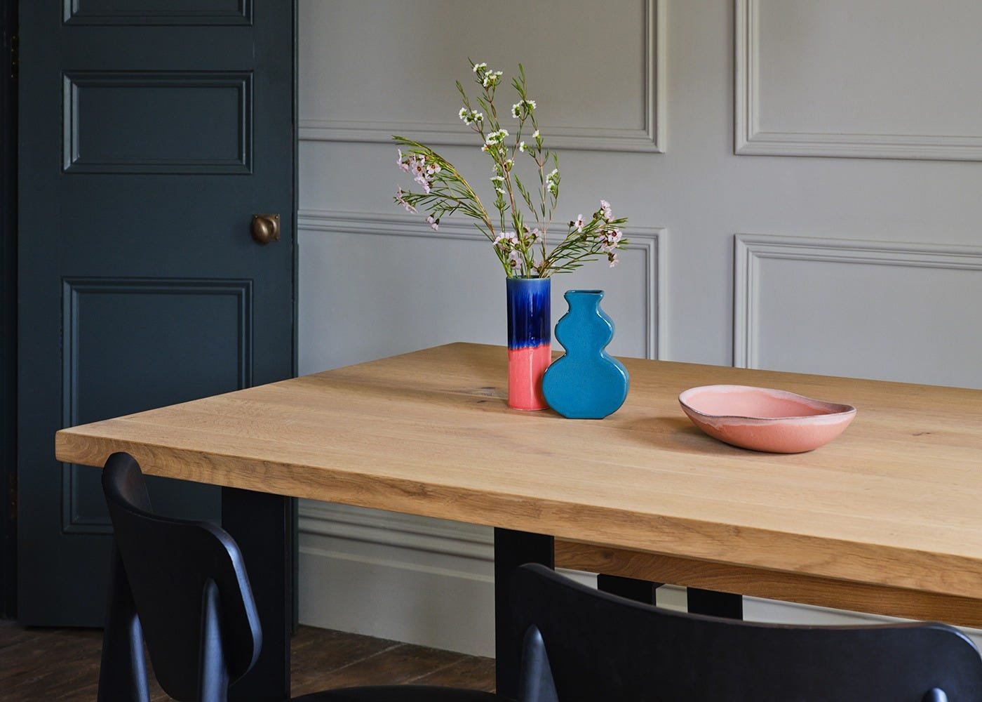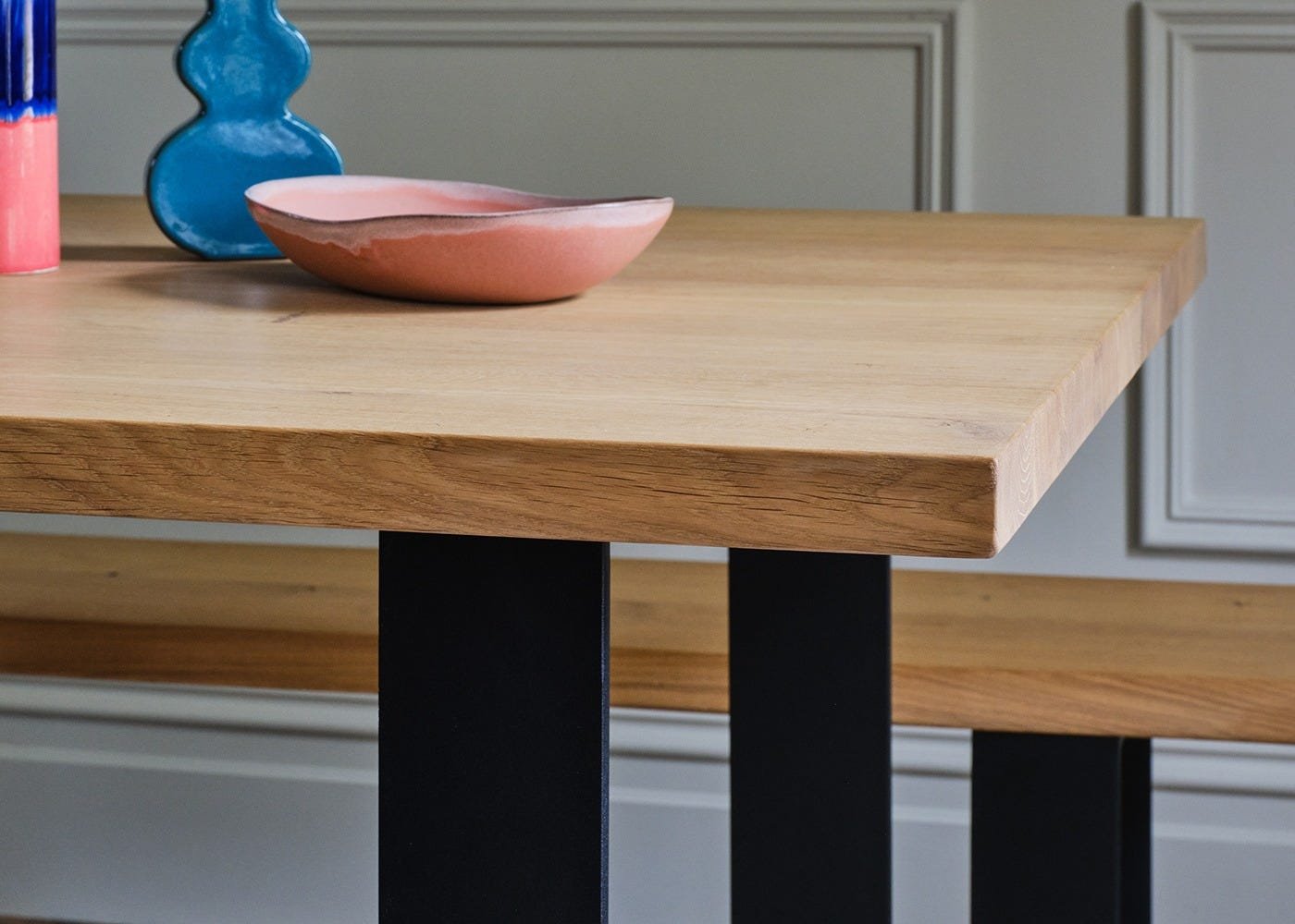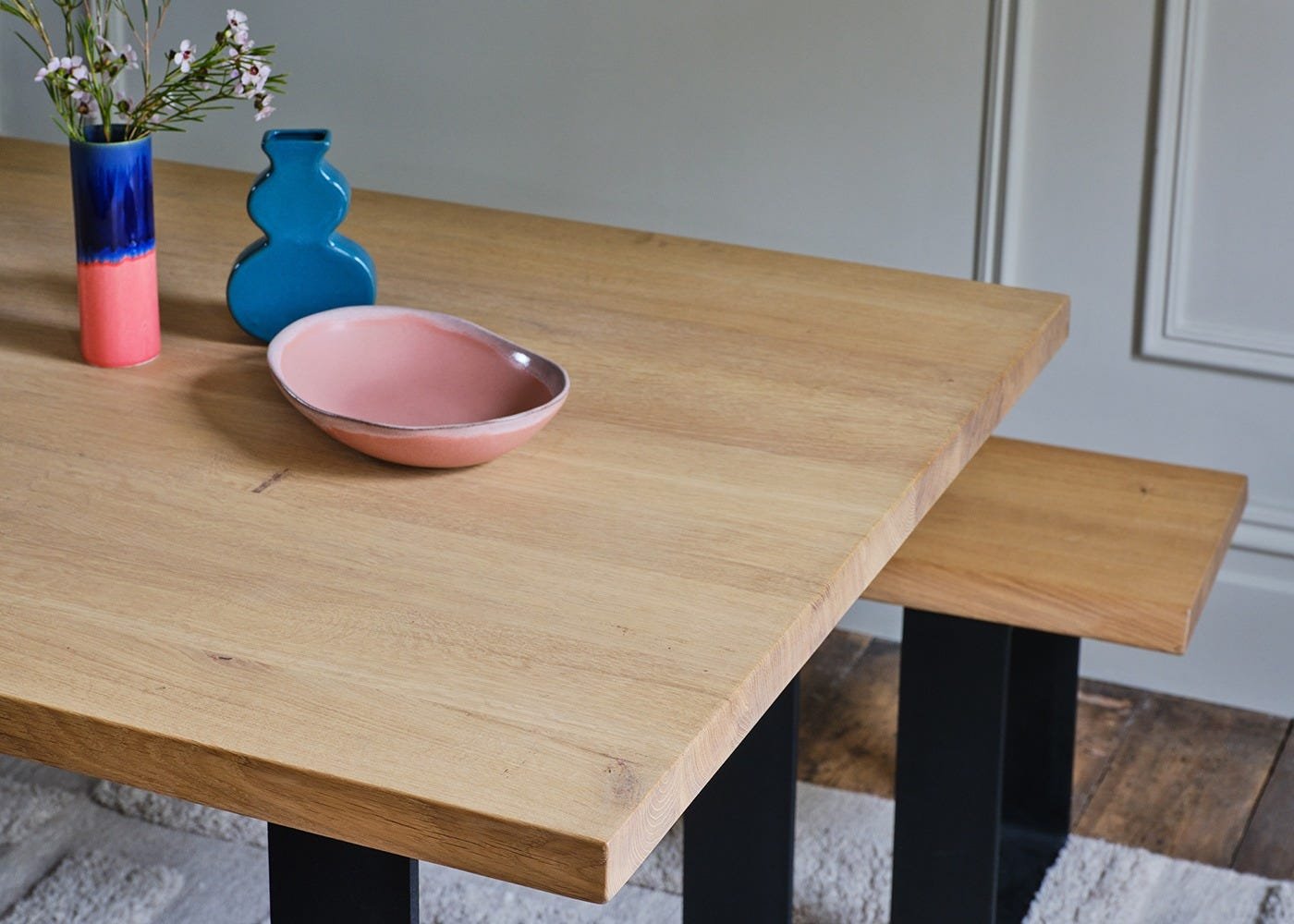 The Prague Dining Table from the Heal’s Bespoke Dining range combines bold industrial character with refined craftsmanship. Its wide metal frame base creates a striking modern silhouette, perfectly suited to contemporary interiors. Expertly crafted from solid oak or walnut in an oiled finish, the design is available in a choice of sizes, finishes and edge profiles to suit your home. Natural grain, knots and colour variations celebrate the unique beauty and individuality of solid wood.