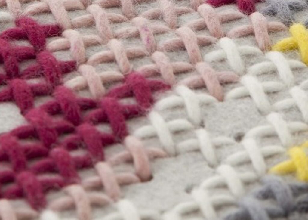Pixelated pattern from perforated soft felt interwoven with brightly coloured thread