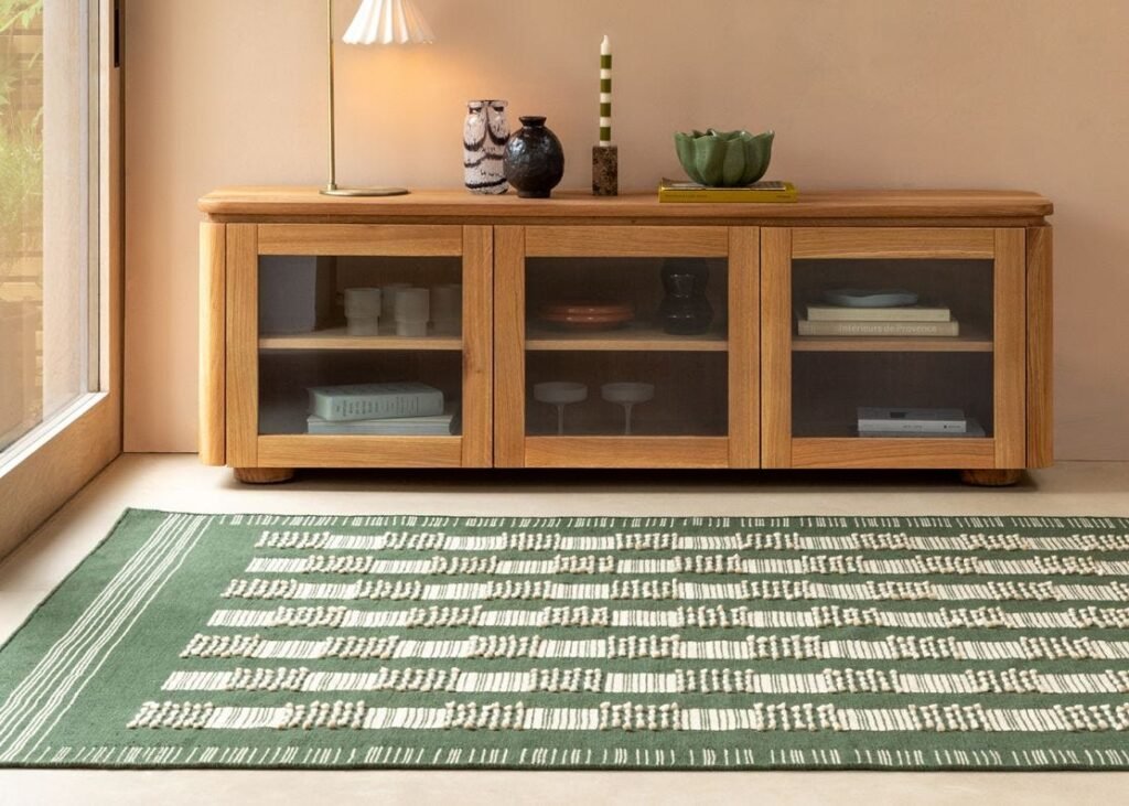 The City Grove Rug in green is a collaborative creation between Heal’s and Ambar, a London-based homeware brand led by Brazilian designer Natalia Nicolau. Handwoven in India, it is crafted from 80% New Zealand wool and 20% cotton, featuring a flatweave base with intricate cut thread detailing. The design is inspired by the idea of bringing nature indoors, perfect for creating a serene retreat in your home.