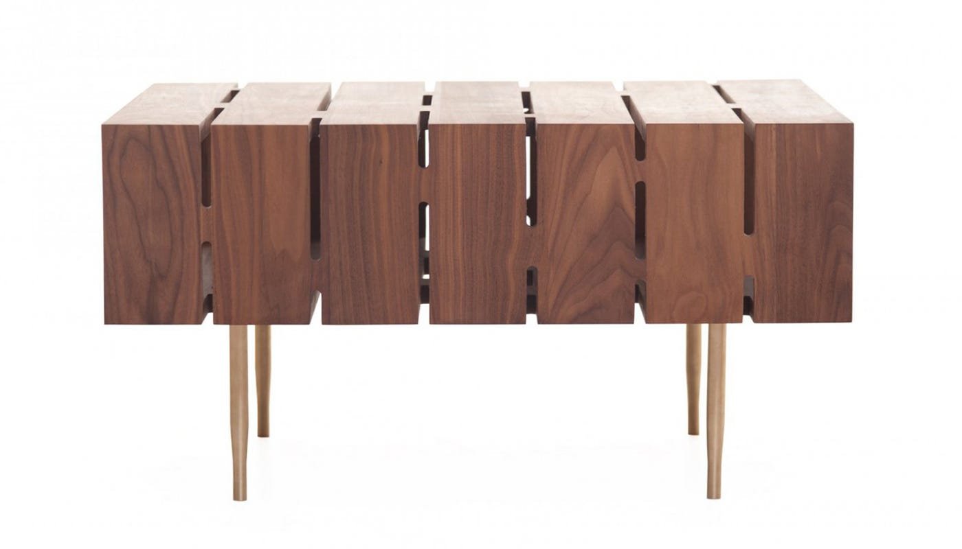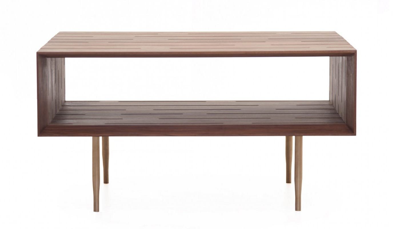 The table is crafted from solid American black walnut using complex joinery techniques and finished with a series of pierced slots that allow light to shine through.