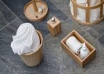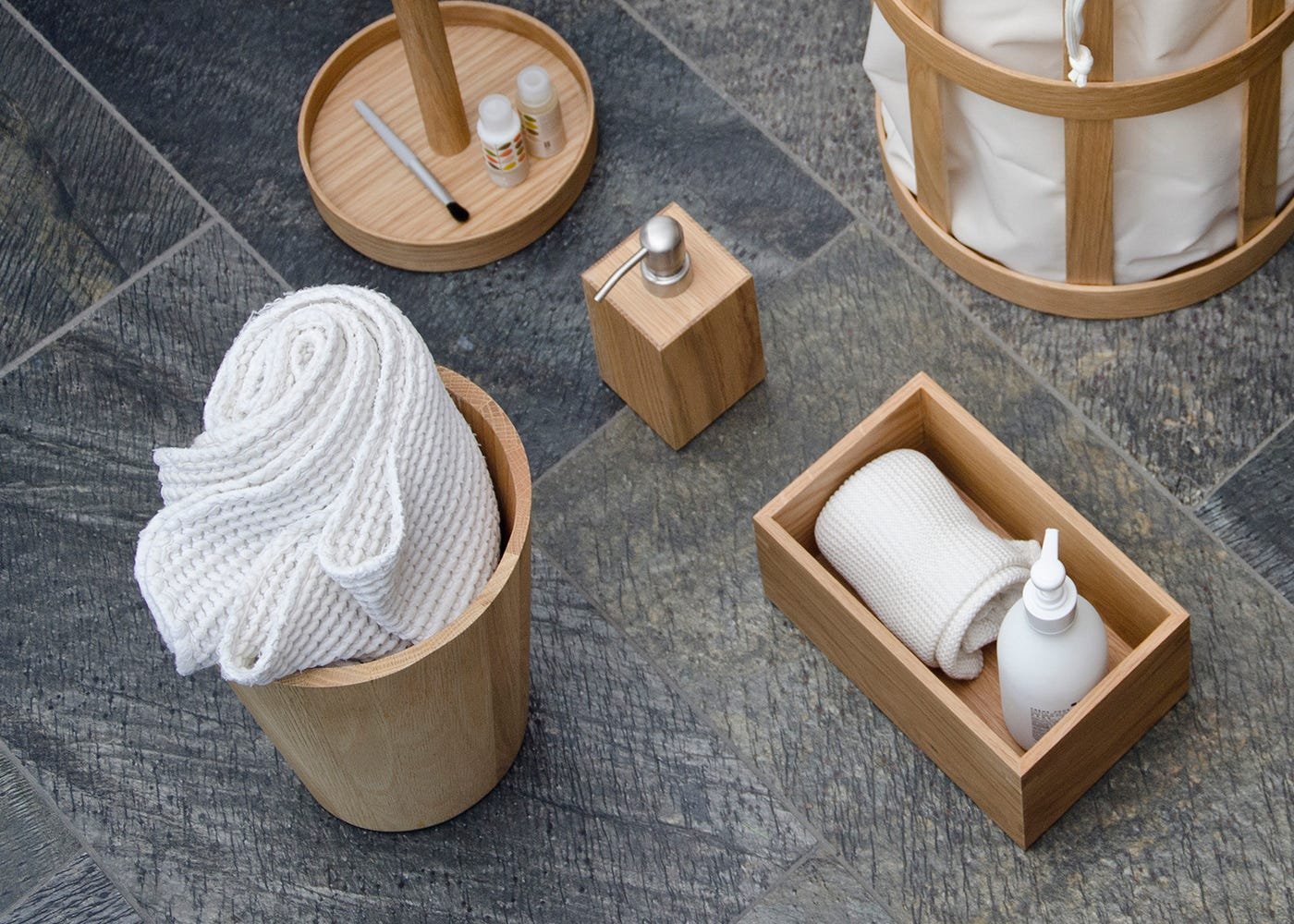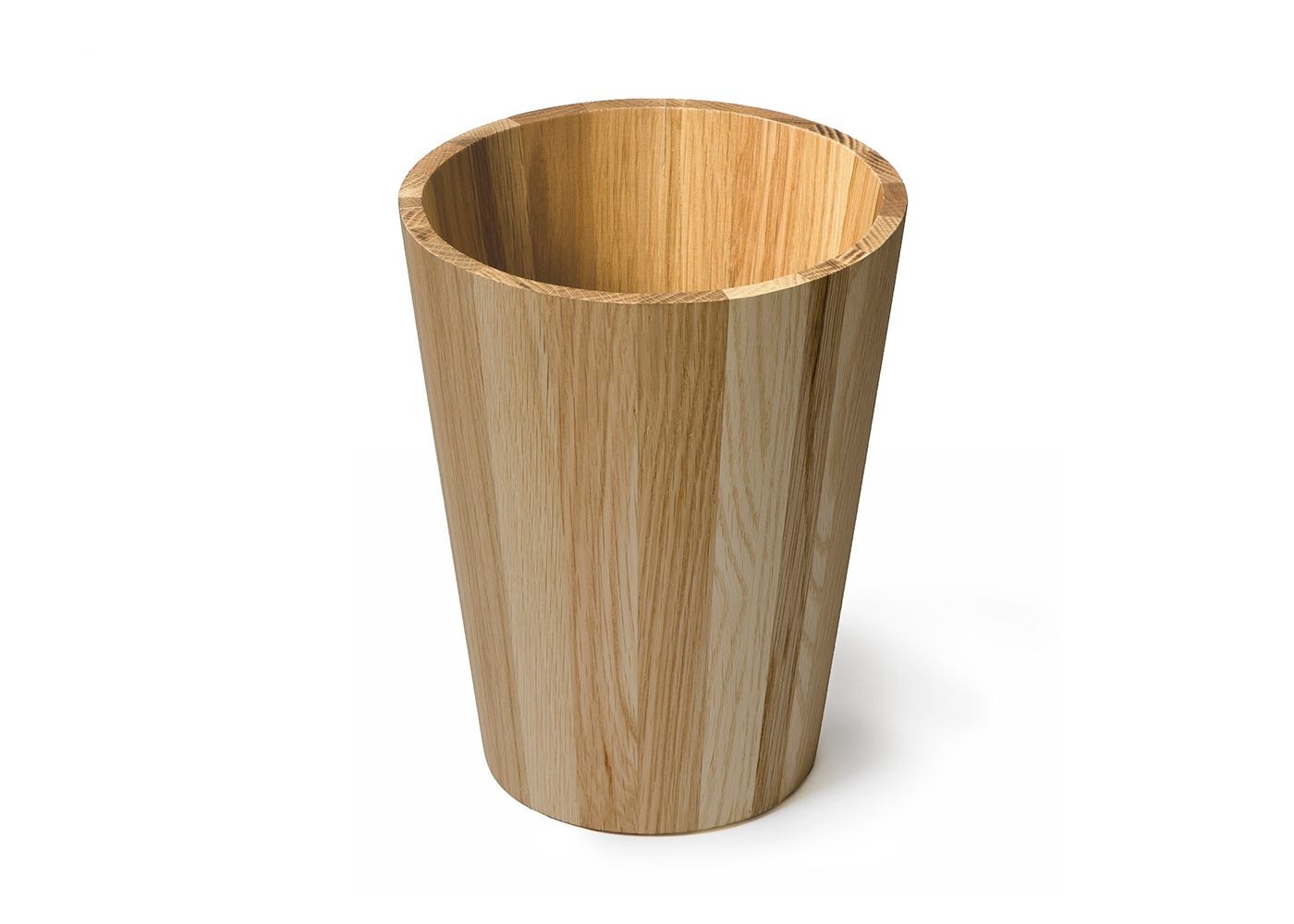 Individually assembled by hand, eighteen blocks of solid American white oak are laminated to form the conical shape. A squared top and bottom edge cut a contemporary look. Perfect for use in a bathroom, bedroom or office. The surface can be easily cleaned inside and out with a soft damp cloth and soapy solution.