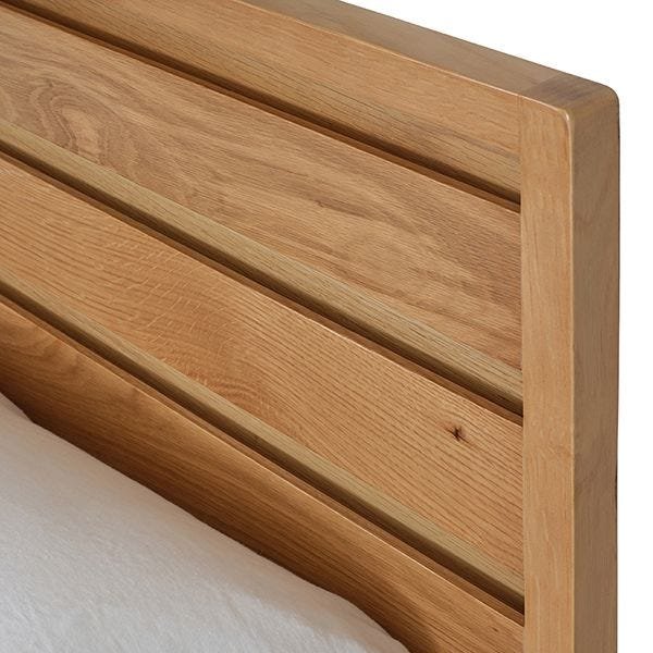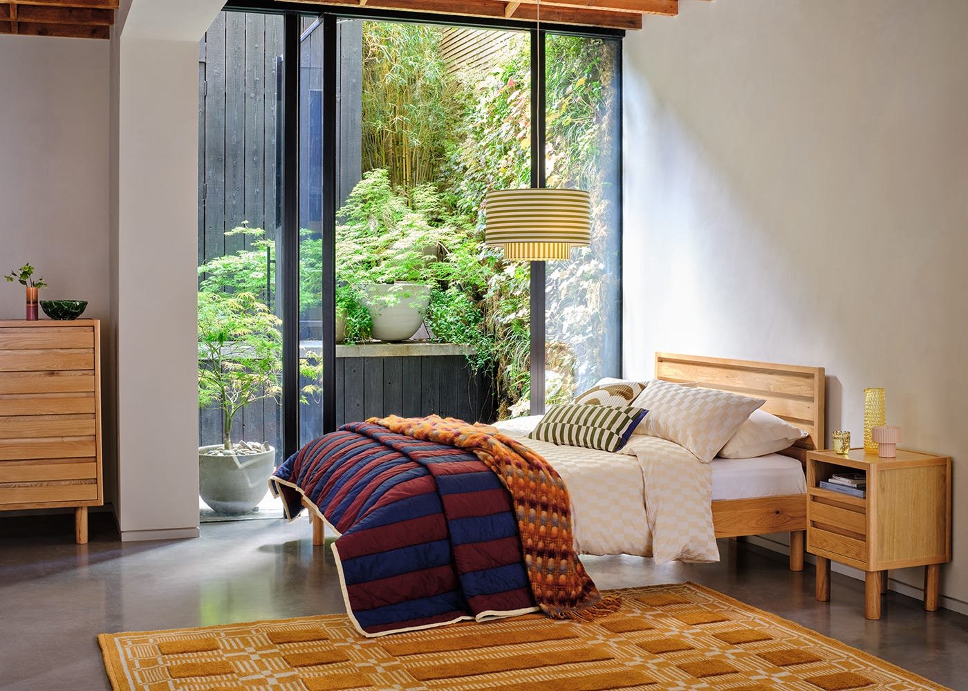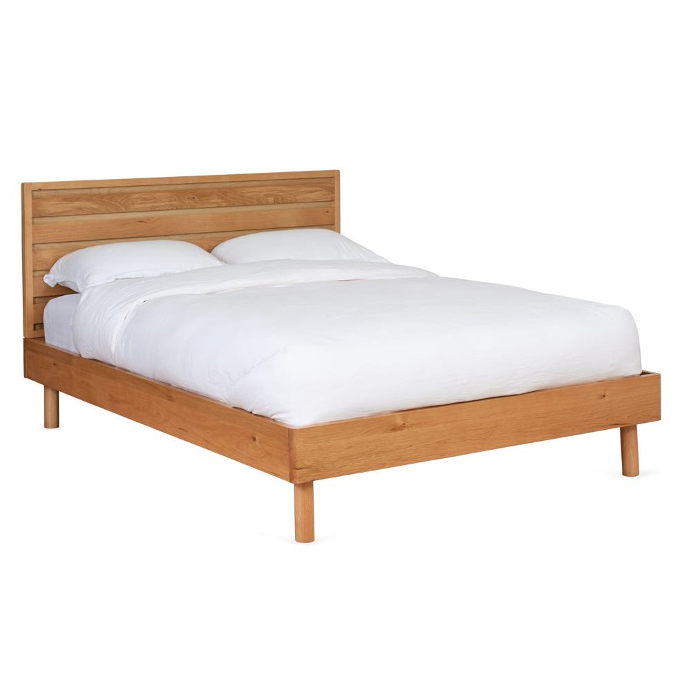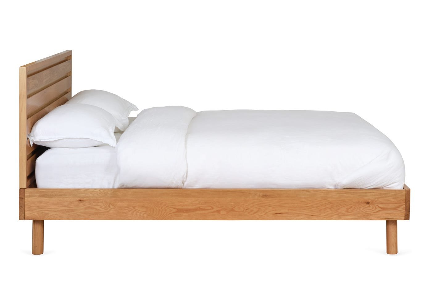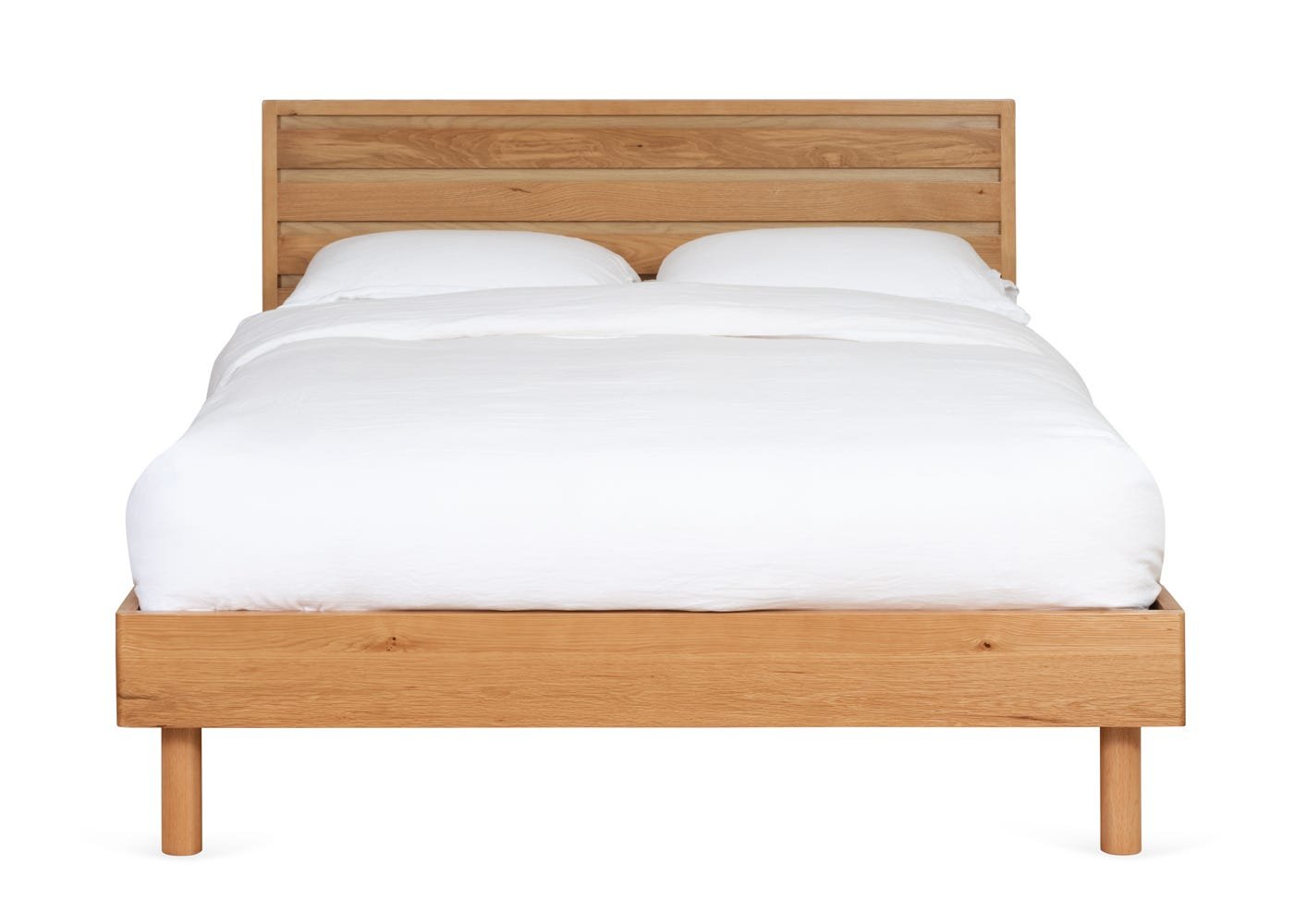 The striking Noella collection balances a bold silhouette with thoughtful design details. The King Bed features a robust oak frame is paired with distinctive slatted fronts and gently curved legs for a refined contrast in form. Crafted from solid wood and veneer, each piece features dovetail box detailing that highlights the natural beauty of the timber. The collection includes a bedside table, tall chest, six-drawer chest, and a triple wardrobe.