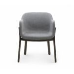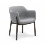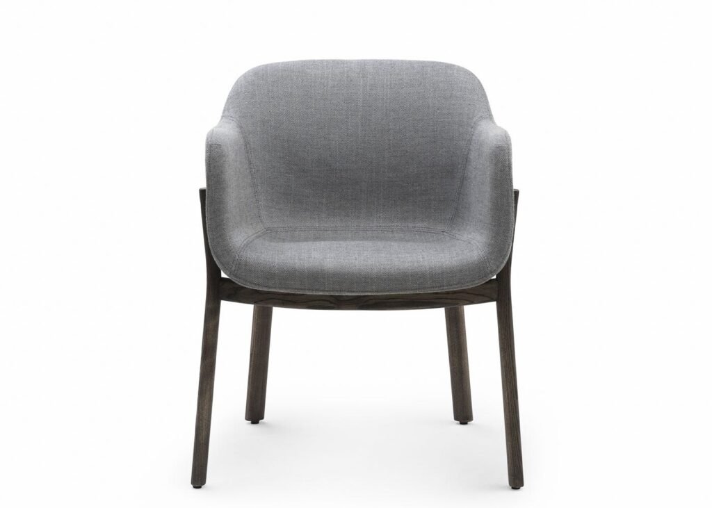 The chair is upholstered in Kvadrat’s Sunniva 2 fabric in a grey finish. Designed by Raf Simons and Fanny Aronsen, Sunniva 2 is woven using a new wool blend that lends the fabric a textural finish.