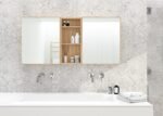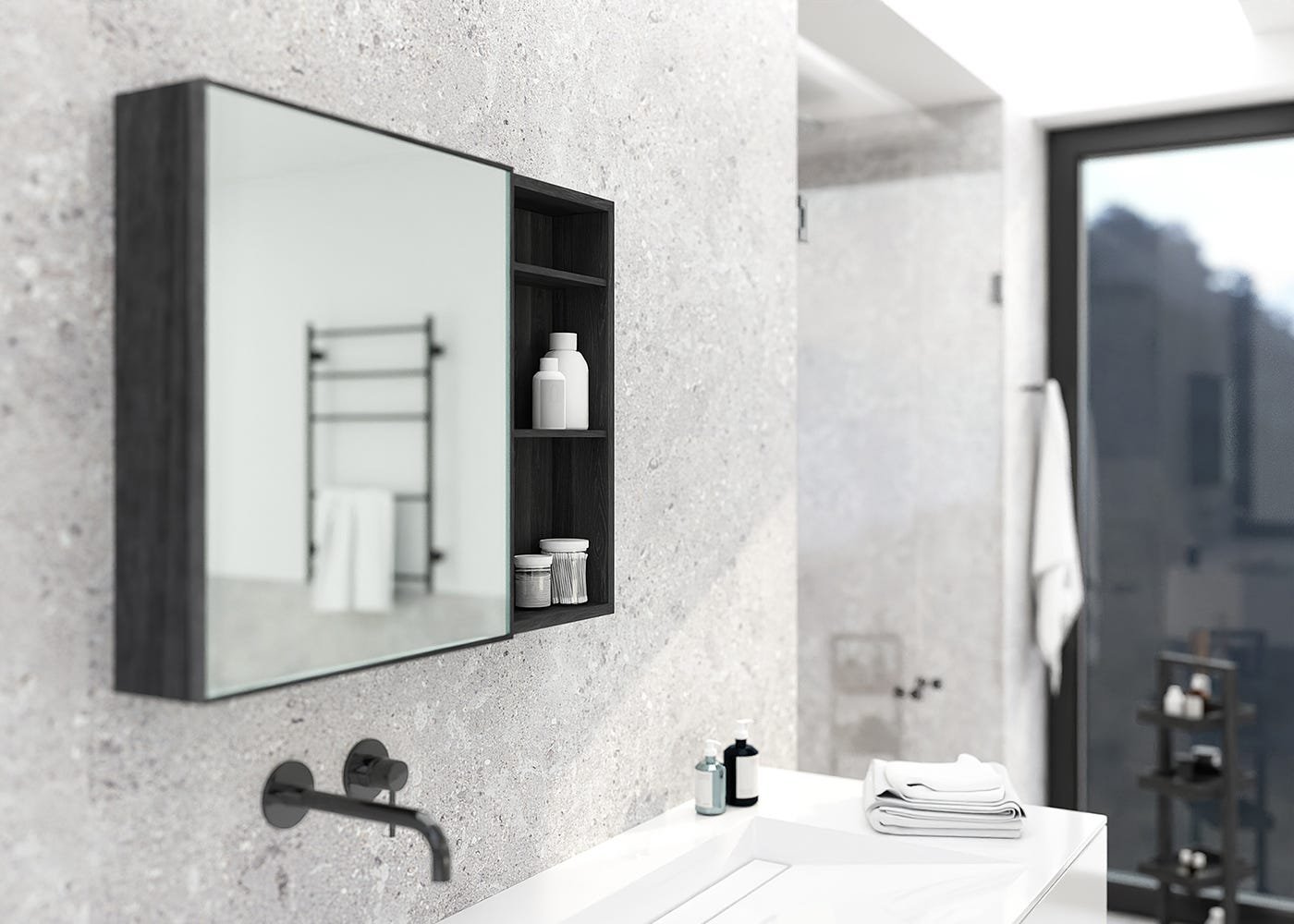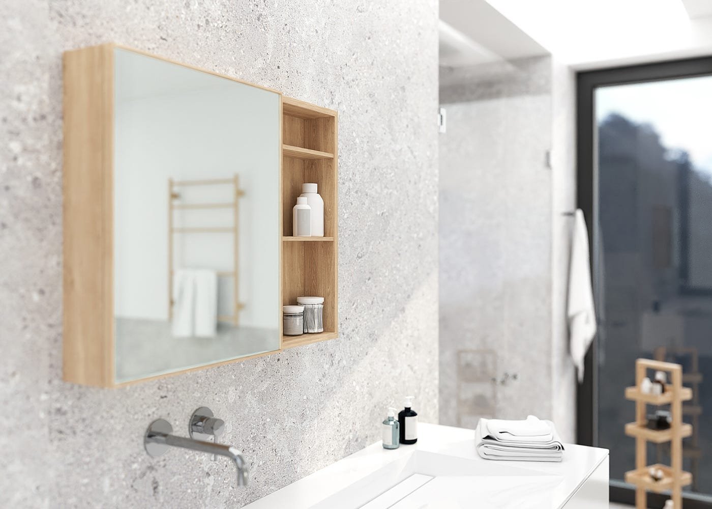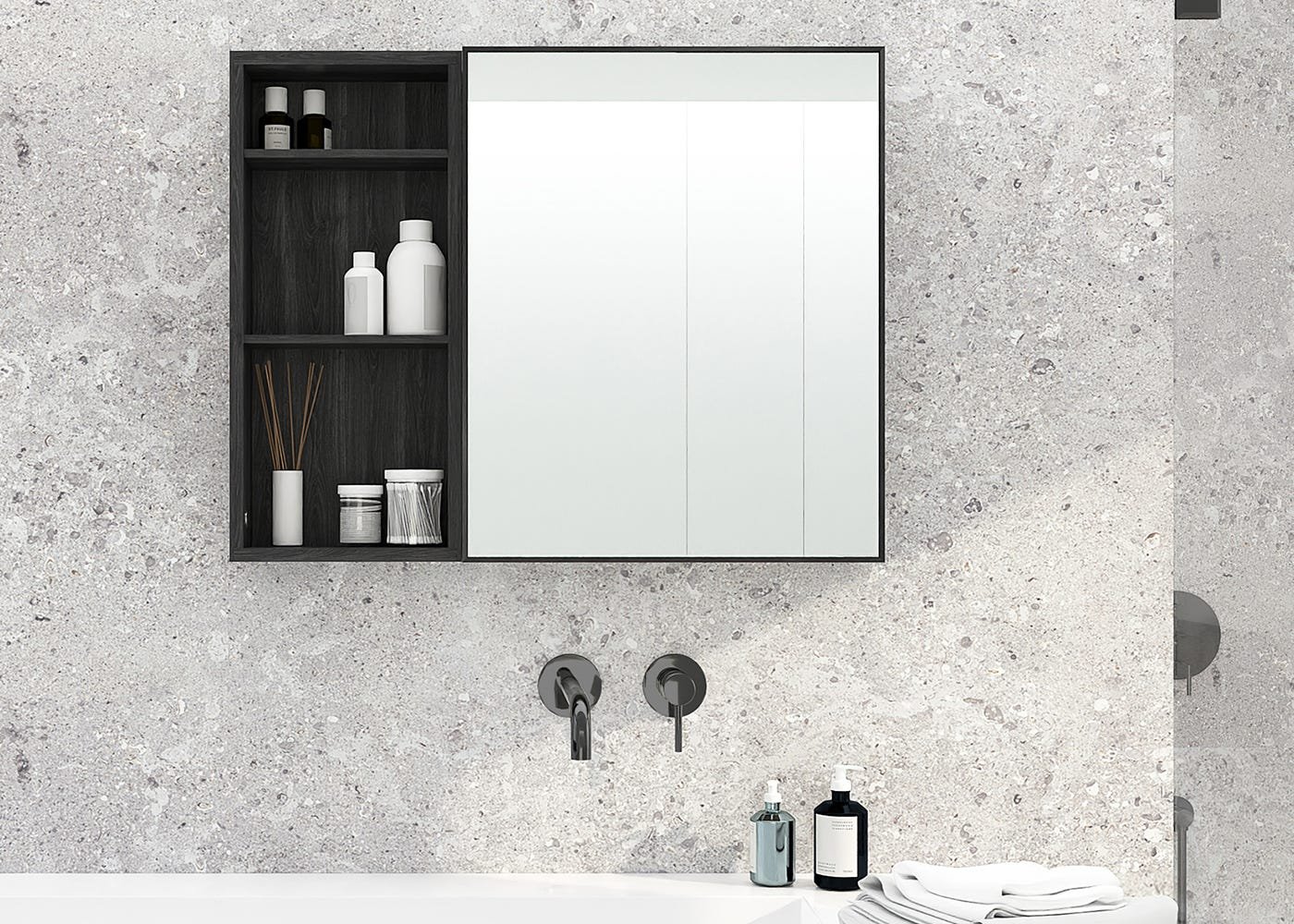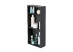 Open cabinet featuring varied shelf heights, perfect for fitting all types of toiletries.