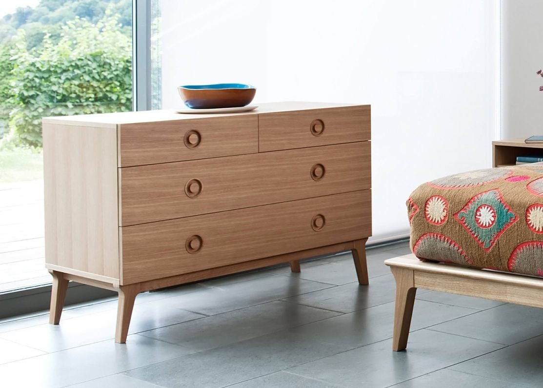 This Valentine chest of drawers by Matthew Hilton features the signature tapered leg detail of the contemporary Valentine range, which lends a visual balance to the piece. Raised up from the ground, the chest creates a feeling of space by keeping sight lines around the room clear. Additionally, it makes it far easier to clean around the bedroom furniture.