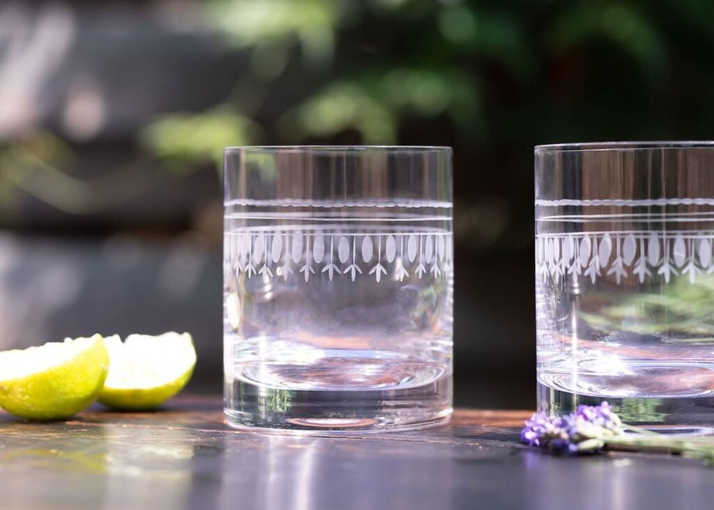 Hand-blown and hand-engraved glass demonstrates quality craftsmanship.