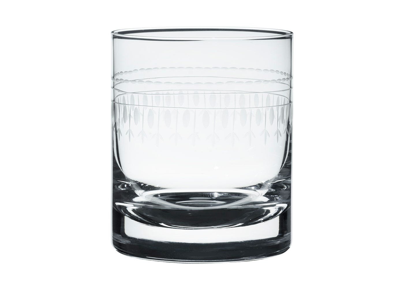A pair of hand-blown and hand-engraved whisky glases with a delicate lens pattern that circles the glass. Each glass is made from fine lead-free crystal and is dishwasher-safe. Perfect for any style of table or type of occasion.